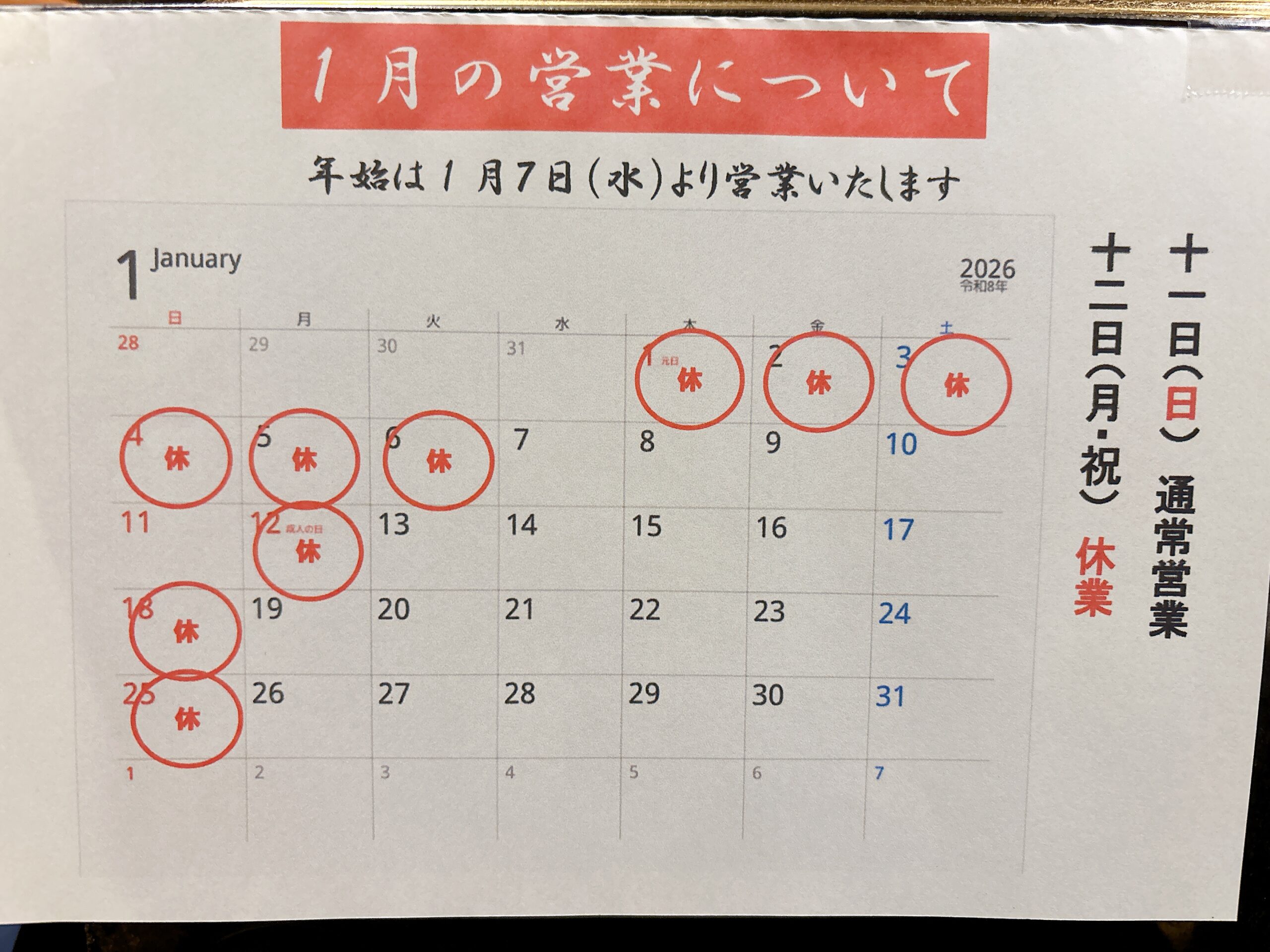 1月の営業について 2025.12.28 Tweet Share Hatena 新年は1月7日(水)より営業いたします。 1月11日(日) 通常営業 1月12日(月・祝) 休業 本年もどうぞよろしくお願いいたします。 Tweet Share Hatena