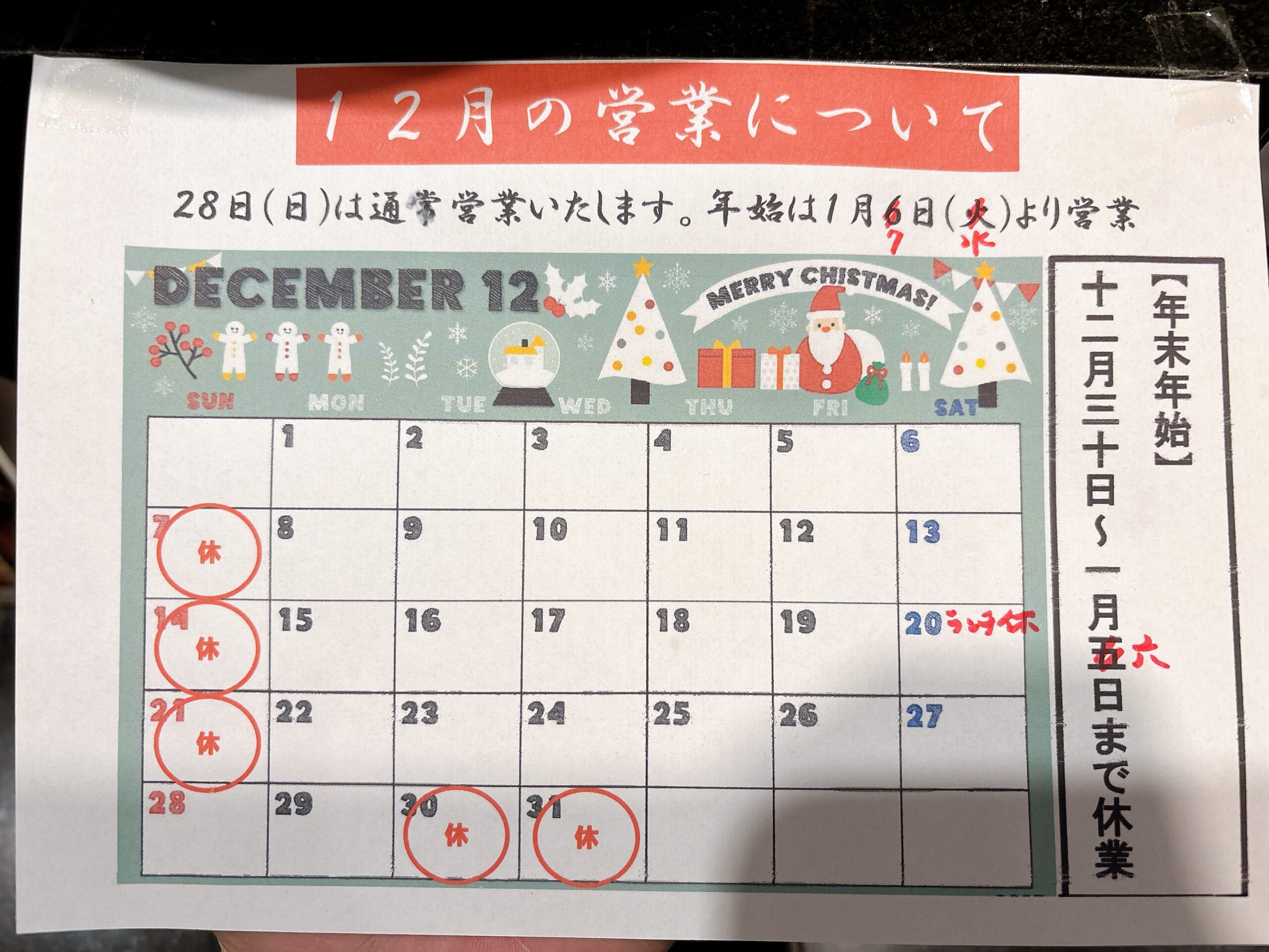 12月の営業日について 2025.12.24 Tweet Share Hatena 12月29日(月)が最終営業日となります。 12月30日~1月6日まで休業いたします。 年始は1月7日(水)より営業いたします。 Tweet Share Hatena