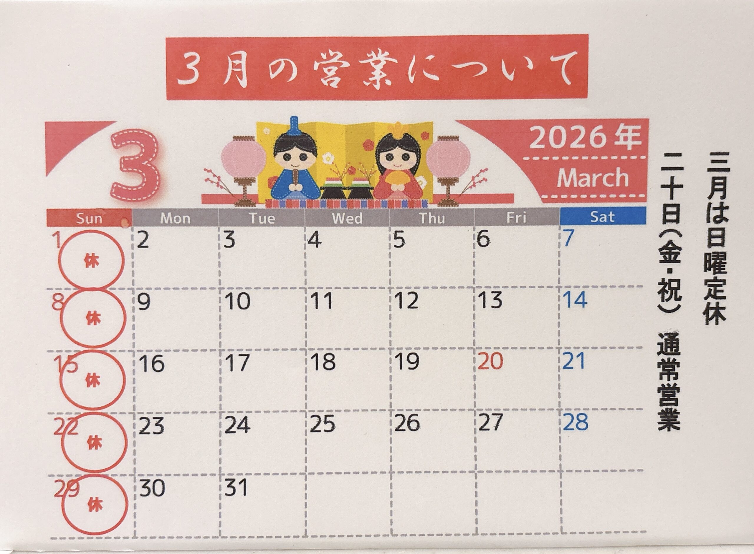 3月は通常通り、日曜定休となり、3月20日(金・祝)も